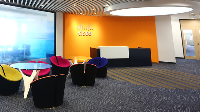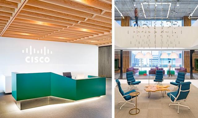 今天不妨帶我們大家去體驗(yàn)一下在美國(guó)舊金山的思科公司的辦公室設(shè)計(jì)。寬敞明亮、點(diǎn)綴著鮮亮色彩、富有現(xiàn)代感的思科公司辦公室,是采用開(kāi)放式風(fēng)格的辦公室設(shè)計(jì),前臺(tái)空間非常寬闊,無(wú)甚遮擋。既便是前臺(tái)大廳的一對(duì)承重柱子,配上原木天花和燈光陪飾,顯得格外堅(jiān)實(shí)、沉穩(wěn),似乎在忠心守衛(wèi)著正中央的企業(yè)標(biāo)志“CISCO”。墨綠色的前臺(tái)呈現(xiàn)不規(guī)則的矩形,別致而富有新意!